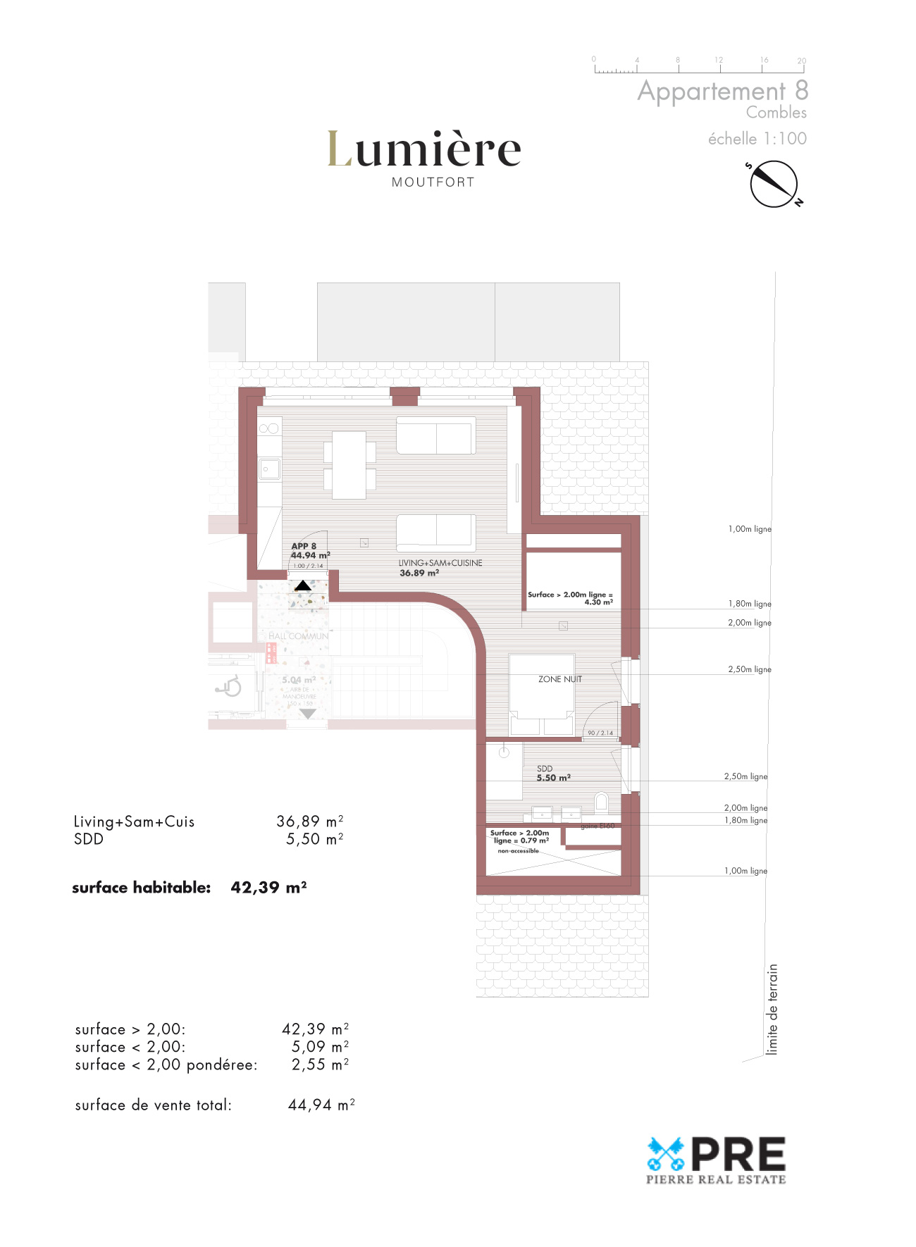 Le studio se compose d’une pièce à vivre de 36,89 m² avec l’espace séjour donnant sur 2 grandes baies vitrées sur toute la largeur, permettant ainsi de dégager de très belles vues. L’espace nuit peut être individualiser afin de créer une chambre séparée. Un grand dressing sous mansarde a été créé. Une salle de bain avec WC est accessible depuis l’espace nuit.
